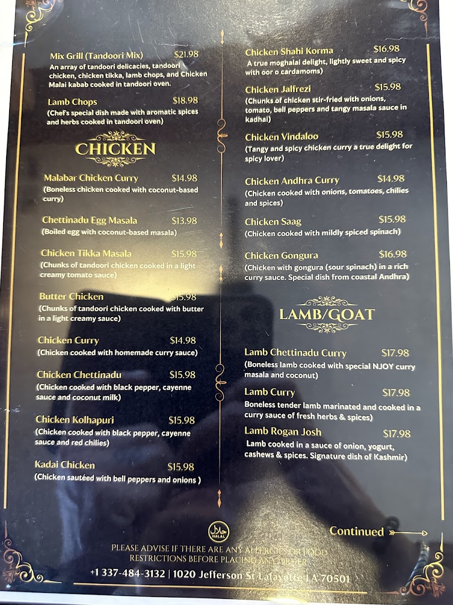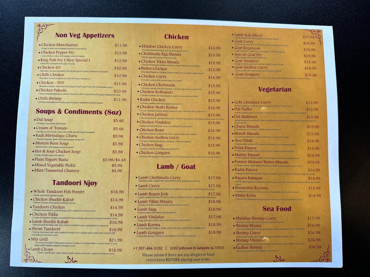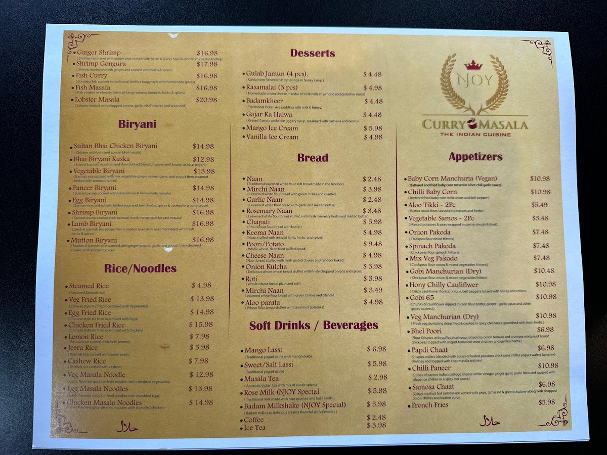 The menu at NJOY Curry Masala offers a well-rounded selection of Indian dishes that balance rich, traditional flavors with a welcoming, casual dining experience. The offerings range from comforting soups and tangy chutneys to hearty mains like tender Lamb Rogan Josh and aromatic Mutton Biryani. Whether you're stopping by for a flavorful lunch or a relaxed dinner, the menu fits seamlessly with the warm, inviting atmosphere of the restaurant.